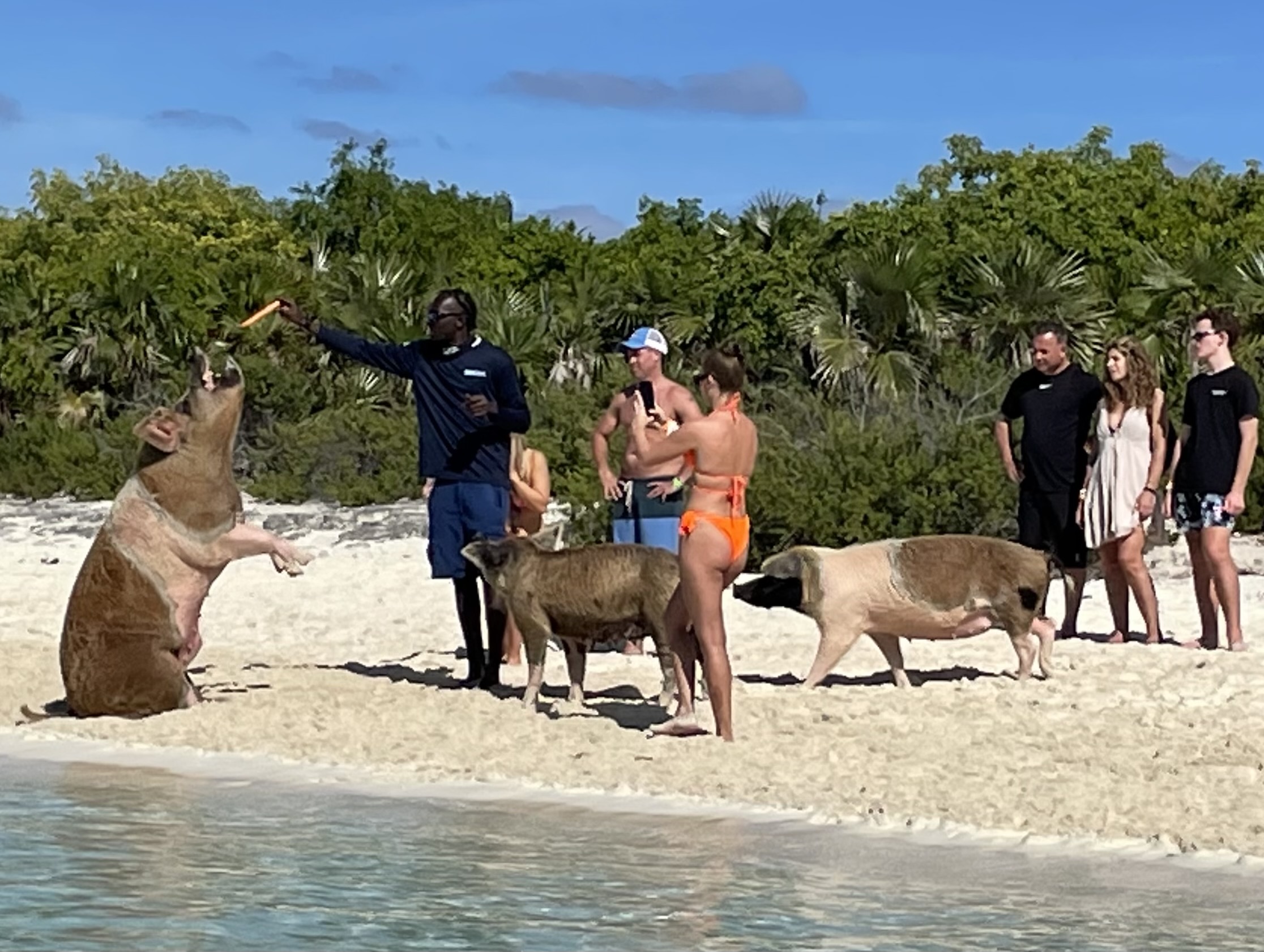 2:30 to 5pm - Hang out on the boat, nap, swim or SUP off deck, watch giant freighters pass within feet of our stern or meet up with folks on Chat 'n Chill beach for basket weaving, volleyball or to share sea stories. There are quite a few Salty Dawg friends that we've caught up with here including Perfect View, Moza Moya and Lickety. One afternoon, when my food order was announced, Walter & KC from Philadelphia sauntered up to our table, during their visit to Exuma.